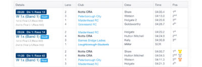 After a shaky start, where Ebony got an immediate advantage, Maddy came through to win the W1x Band 1 Final here at Peterborough. Ebony, racing at 38, pushed hard for the win, eventually getting 2nd after the good start and a well judged race.